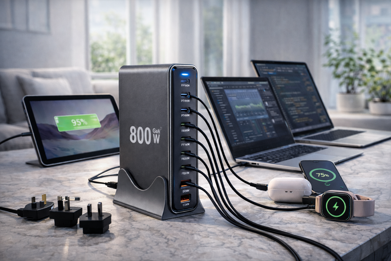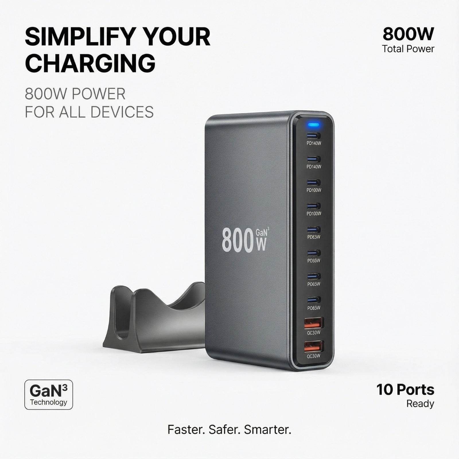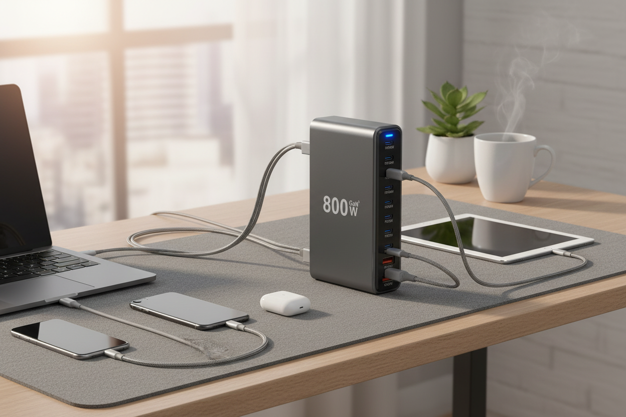 High-power 800W fast charging for multiple devices. Eliminates clutter from multiple chargers and adapters. Ideal for work-from-home, office desks, and travel setups.